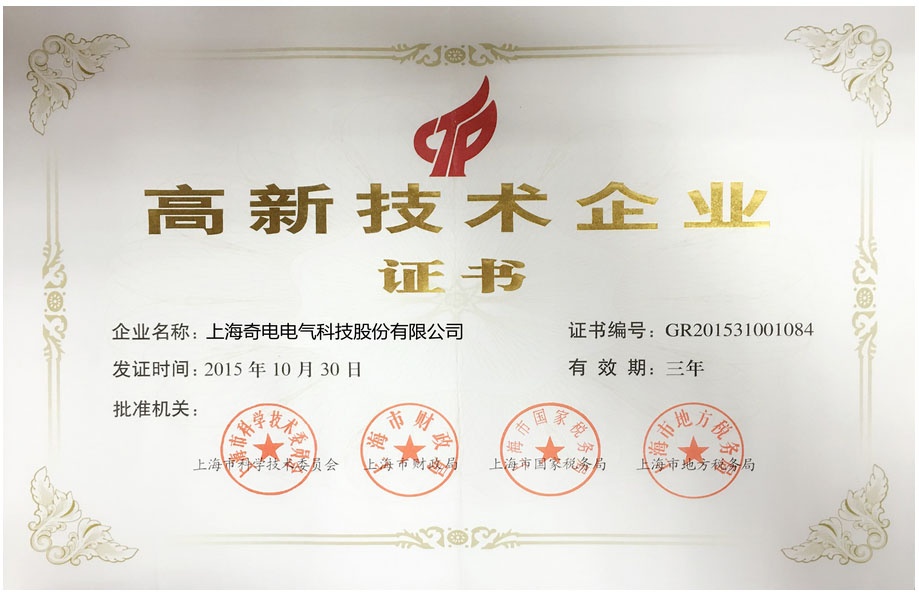 热烈庆祝上海太阳集团tyc4633电气科技股份有限公司荣获由上海市科技部、上海市财政部、上海市国家税务总局和上海市地方税务局联合颁发的高新技术企业证书。