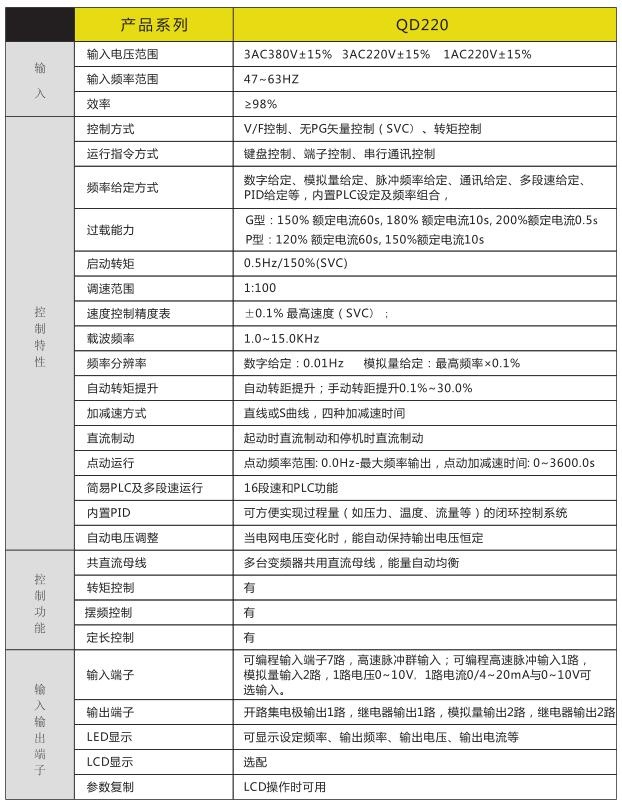 QD220系列矢量通用型变频器为功能增强型产品,采用DSP控制系统,完成优化的无速度传感器控制、V/F控制,功能更优化,应用更灵活,性能更稳定。可广泛应用于风机,泵类负载及速度控制精度、转矩响应速度、低频输出特征有较高要求的应用场合。